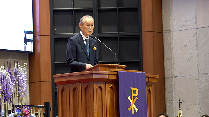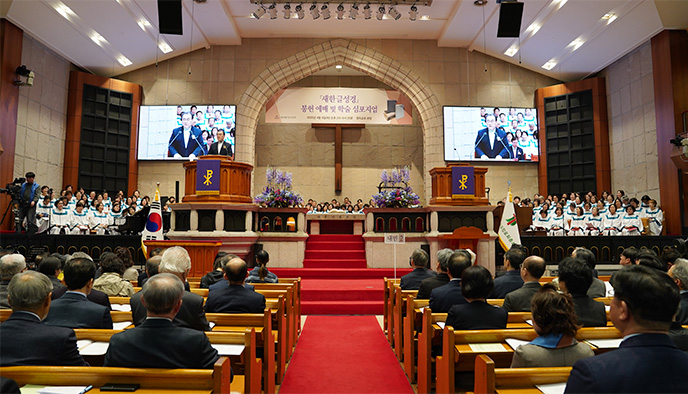 <『새한글성경』 봉헌 예배 인도를 맡은 대한성서공회 김경원 이사장>
