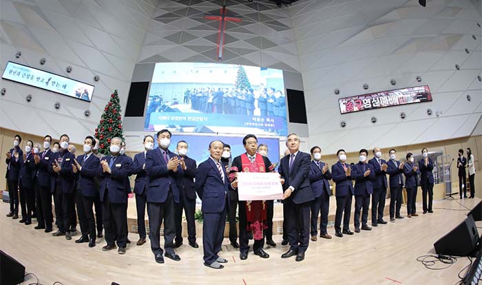 (왼쪽부터 주안중앙교회 이종철 장로, 박응순 목사, 대한성서공회 호재민 총무)