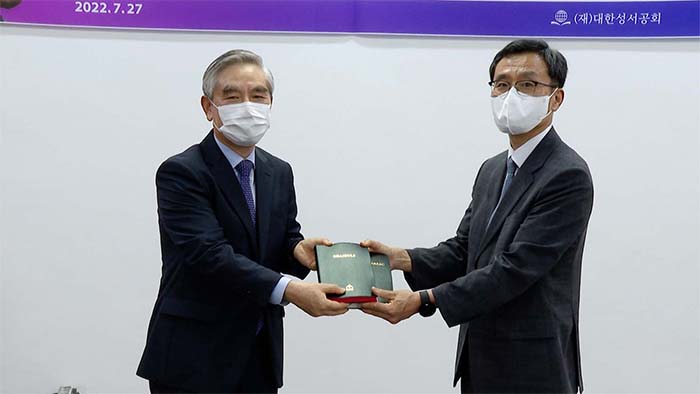<성경 증정(왼쪽부터 본 공회 호재민 총무, 서울광염교회 권대현 집사)>