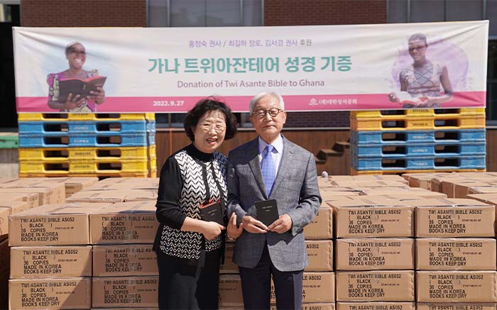 2022년 9월 27일, 홍정숙 권사, 최길하 장로·김서경 권사의 후원으로 가나에 <트위 아잔테어 성경> 15,205부를 보내는 기증 예식을 가졌습니다.