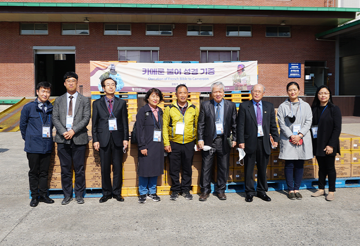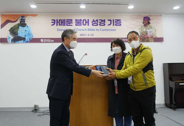 2021년 3월 23일 오후 1시, 대한성서공회 반포센터(경기도 용인시 소재)에서 김천제일교회(조병우 목사) 김창남 집사, 김계화 권사의 후원으로 카메룬에 <불어 성경> 9,400부를 보내는 기증식을 가졌다.