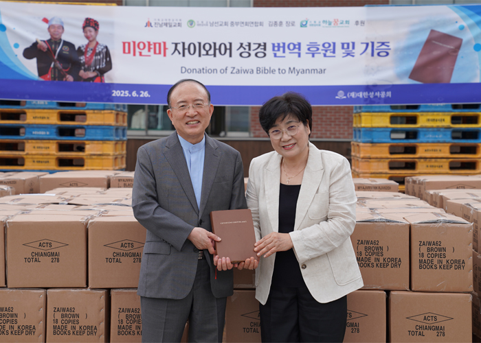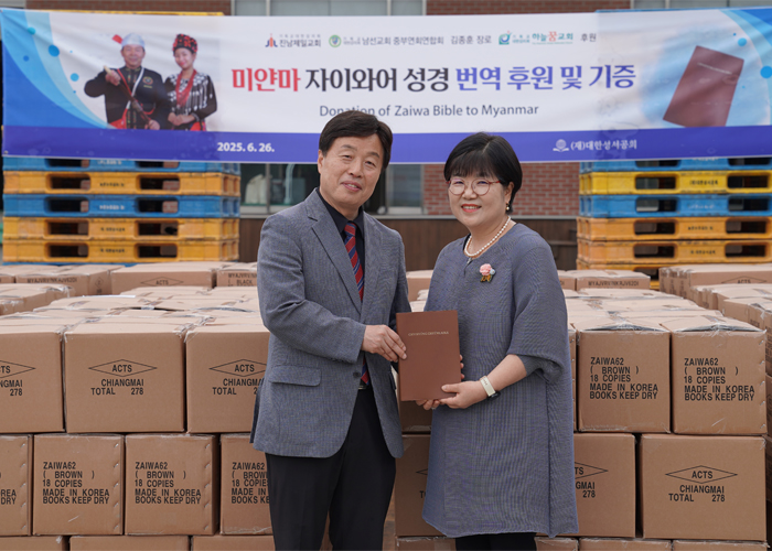 2025년 6월 26일, 본 공회(이사장 이선균 목사)에서는 진남제일교회(김대영 목사), 기독교대한감리회 남선교회 중부연회연합회, 김종훈 장로(산곡교회), 하늘꿈교회(신용대 목사)의 후원으로 번역된 <자이와어 성경> 4,998부를 미얀마에 보내는 기증 예식을 가졌습니다.
