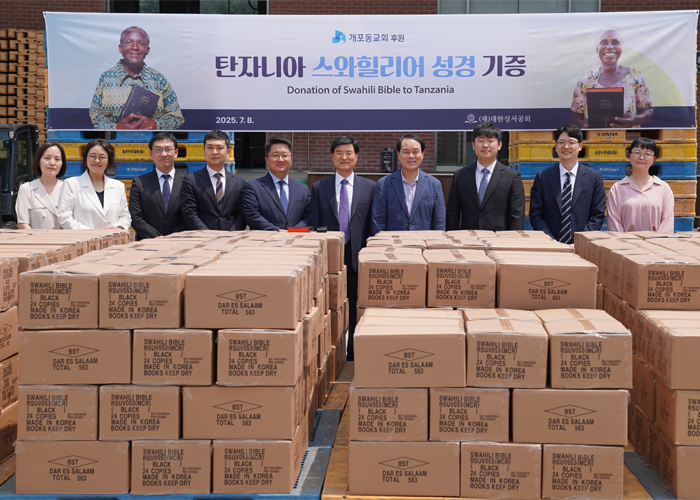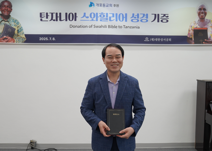 2025년 7월 8일, 본 공회(이사장 이선균 목사)에서는 개포동교회(이풍인 목사)의 후원으로 탄자니아에 <스와힐리어 성경> 5,643부를 보내는 기증 예식을 가졌습니다. 개포동교회는 금년, 부활절을 기념하며 온 성도가 성경 후원을 위해 헌금하였으며, 작년 6월 르완다에 <킨야르완다어 성경> 5,000부를 후원한 이후 두 번째로 해외 성경 보내기에 동참하고 있습니다.