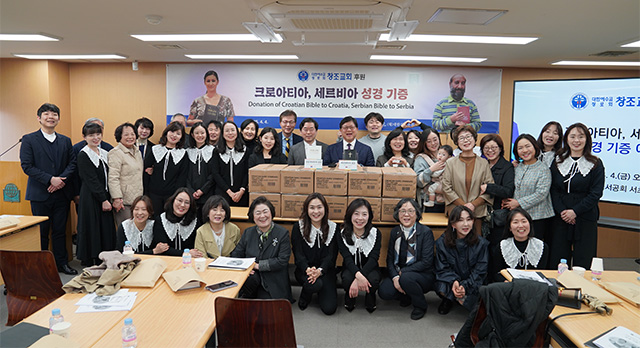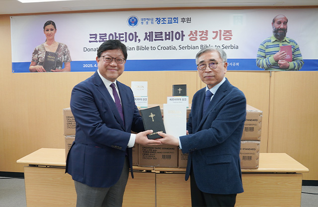 2025년 4월 4일, 본 공회(이사장 김경원 목사)에서는 창조교회(홍기영 목사)의 후원으로 유럽 동부에 있는 발칸반도의 서부 지역에 위치한 두 나라인 크로아티아와 세르비아에 각각 <크로아티아어 성경> 1,400부, <세르비아어 성경> 5,310부를 보내는 기증 예식을 가졌습니다. 창조교회는 2015년부터 해외 성경 보내기에 동참하고 있으며, 이번 크로아티아, 세르비아까지 8개 나라에 총 40,353부의 성경을 후원했습니다.