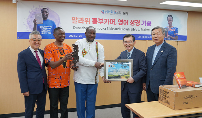 2024년 7월 24일, 본 공회(이사장 김경원 목사)에서는 성남제일교회(홍정기 목사)의 후원으로 말라위에 <툼부카어 성경> 1,000부, <영어 성경> 400부를 보내는 기증 예식을 가졌습니다.