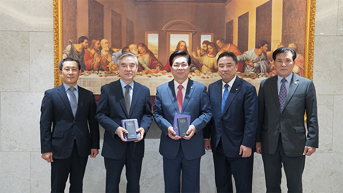 [성경 증정(왼쪽부터 본 공회 정경재 본부장, 호재민 총무, 여의도순복음교회 이영훈 담임목사, 고영용 목사, 김광환 장로)]