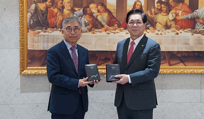 <성경 증정(왼쪽부터 본 공회 권의현 사장, 여의도순복음교회 이영훈 목사)>