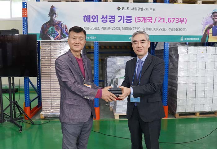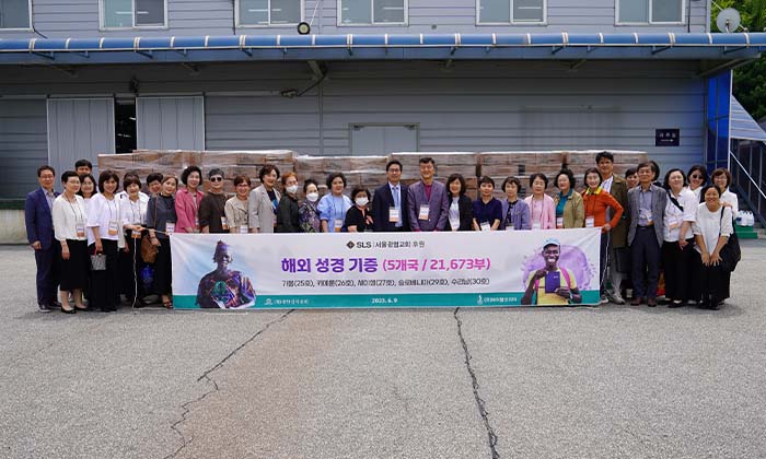 2023년 6월 9일, 서울광염교회(조현삼 목사)의 후원으로 해외 5개국에 성경 21,673부를 보내는 기증 예식을 가졌습니다.(가봉-불어 성경 6,175부, 카메룬-불어 성경 7,452부, 세이셸-영어 성경 1,720부, 슬로베니아-슬로베니아어 성경 2,300부, 수리남-네덜란드어 성경, 영어 성경 4,026부)