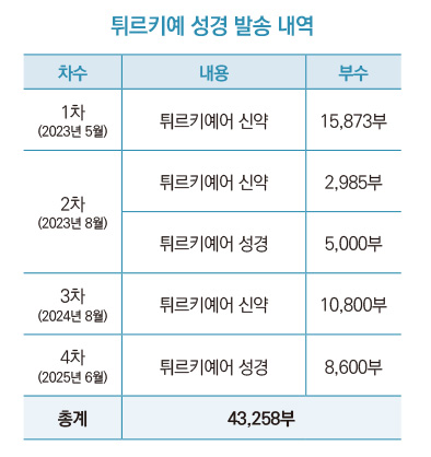 2023년 2월, 튀르키예에 발생한 대지진은 튀르키예 전역에 깊은 상처를 남겼습니다. 무너진 삶의 자리를 회복해 가는 과정 속에서, 터키성서공회는 말씀을 통한 위로와 소망을 바라며 성경 지원을 요청해왔습니다. 본 공회는 한국교회의 후원을 받아 튀르키예에 보급할 성경을 제작하였고, 지금까지 튀르키예에 4차례에 걸쳐 총 43,258부의 성경을 발송하게 되었습니다. 계속해서 한국교회와 협력하여 튀르키예에 성경 보급을 이어갈 예정입니다.