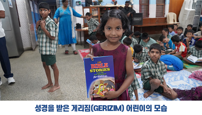 인도성서공회의 안내를 받아 처음 방문한 곳은 지체 장애 어린이들을 보호하고 돌보는 시설인 게리짐(GERIZIM)이었습니다. 장애가 있다는 이유로 부모가 자녀만 남겨두고 떠나거나 보육원에서도 돌보기 어려운 아이들이 모여 생활하고 있었습니다. 나이에 따라 어린이들에게 그림 성경과 성경을 보급하였습니다. 환하게 웃는 어린이들의 모습에서 기쁨과 감사가 묻어났습니다. 어린이들이 함께 부르는 찬양은 화음이 맞지 않고 제각각이었지만, 마치 천사들의 노래처럼 듣는 이들에게 깊은 감동을 주었습니다.