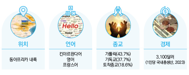 ‘천 개의 언덕을 가진 나라’로 불리는 르완다는 국토의 80% 이상이 산과 언덕으로 이루어져 있습니다. 산악 지형이 주를 이루며, 다양한 기후 속에 많은 동식물들이 서식하고 있는 아름다운 자연의 나라입니다. 하지만 천 개의 언덕만큼이나 해결해야 할 많은 아픔과 문제를 갖고 있는 나라이기도 합니다.